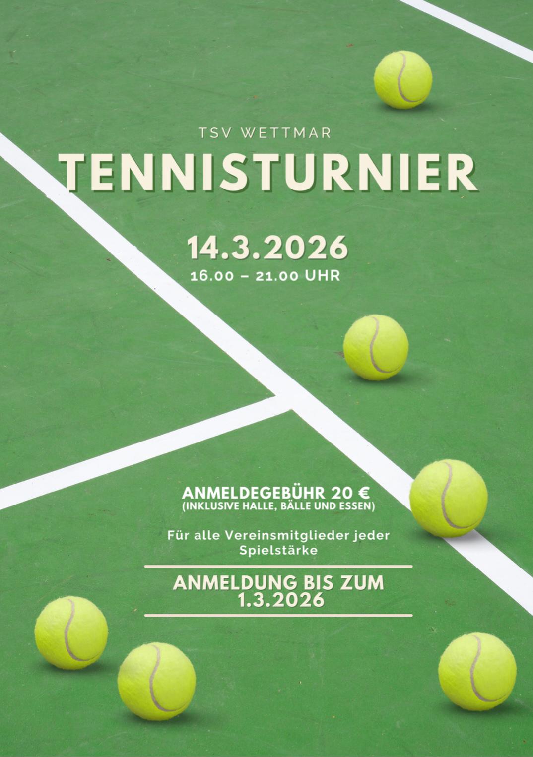 Unser vereinseigenes Tennisturnier steht an! Eingeladen sind Spielerinnen und Spieler aller Spielklassen. In der Anmeldegebühr sind die Platzgebühr, die Bälle sowie ein gemeinsames Essen enthalten.